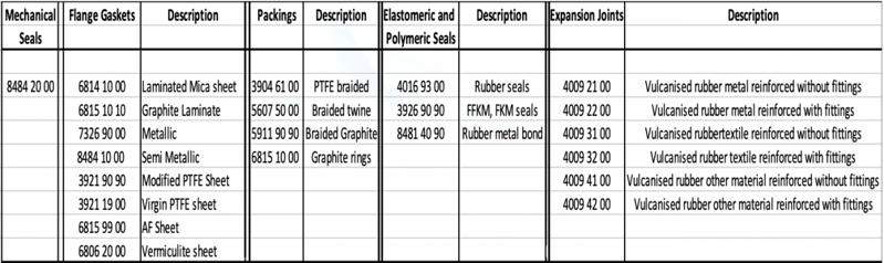 The basis for the research was the international codes definitions in the UN comtrade database, and in the case of gaskets, the US Customs and Borders agency definitions for gaskets. These documents enabled the group to come up with the correct definition for each product.