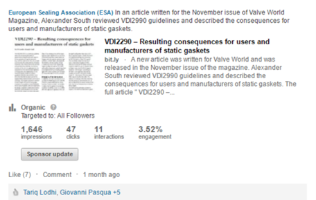 ESA LinkedIn page is steadily getting new followers. We have 492 followers so far, with engagement rate of the posts between 0.90 % and 3.53% in the last 2 months. The most engaged post was the news with ESA’s article in November issue of Valve World Magazine with Alexander South’s review of VDI2990 guidelines.