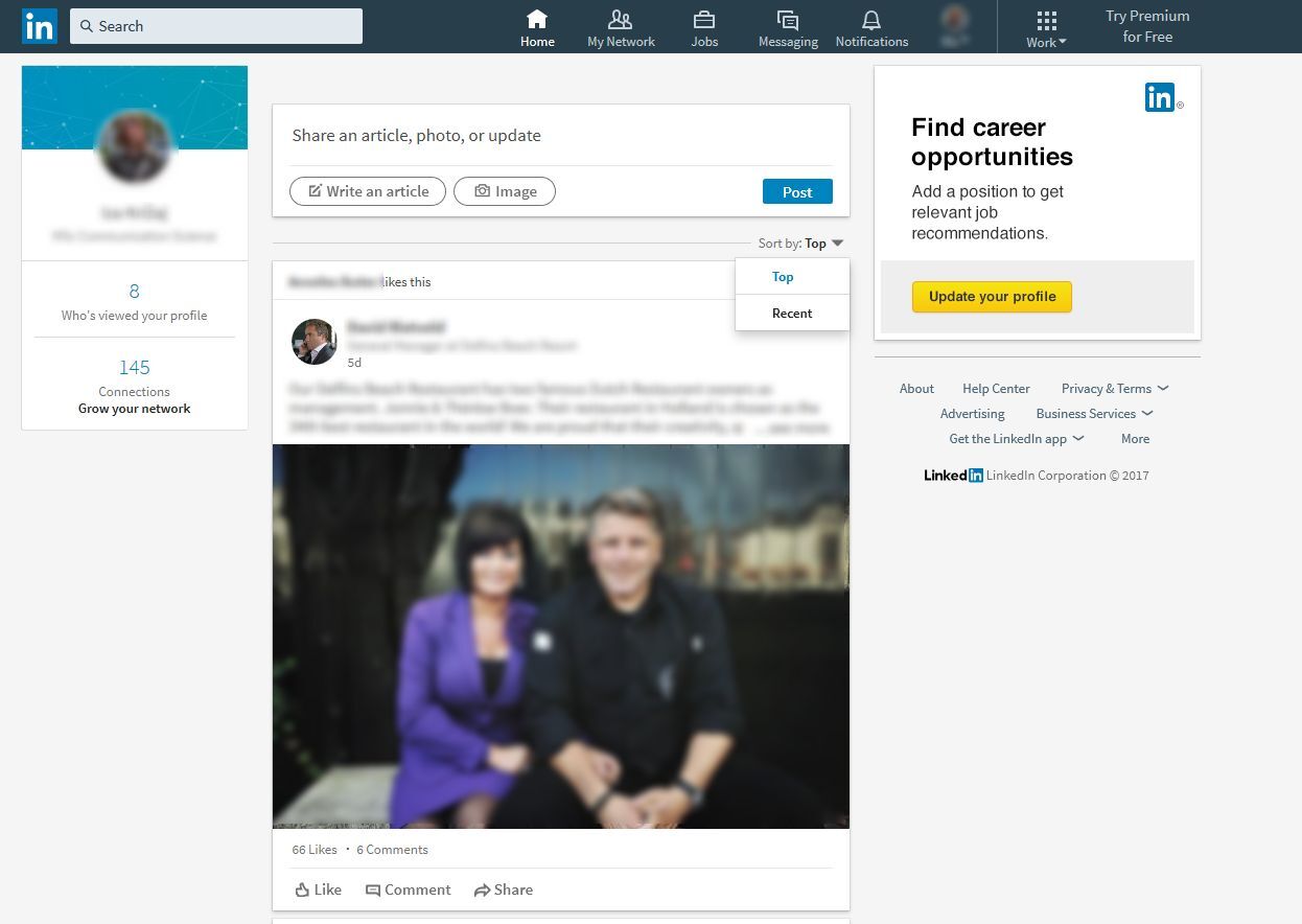 The central position of the homepage belongs to the content sharing option. Above the newsfeed, which you can sort by “top” or “recent”, there is the button to post and share your own content. As we already learned, it is important to publish useful and meaningful work related content in order to establish yourself as a thought leader and grow your network further.