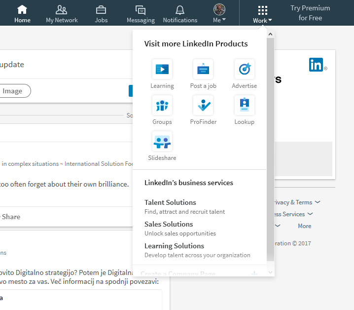 The elements of the homepage top menu are pretty much the same as with the old LinkedIn, however the names and icons have changed to give a cleaner look. Your profile can now for instance be accessed in the “Me” section.
