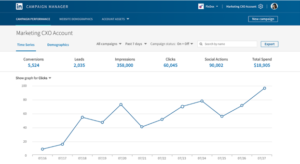 LinkedIn’s advertising platform (Campaign Manager) lets you analyse the performance of your ads with various metrics: clicks, video impressions, click-through rate, engagement, number of conversions and conversion rate, number of leads you get from your ads, etc.